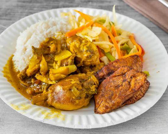 Served with stir-fried cabbage and choice of rice and peas or white rice.